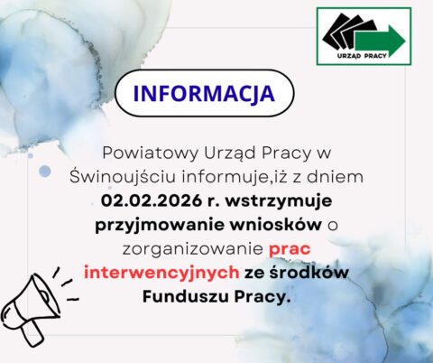 WAŻNA INFORMACJA Powiatowy Urząd Pracy w Świnoujściu informuje, iż z dniem 02.02.2026 r. wstrzymuje przyjmowanie wniosków o zorganizowanie prac interwencyjnych ze środków Funduszu...