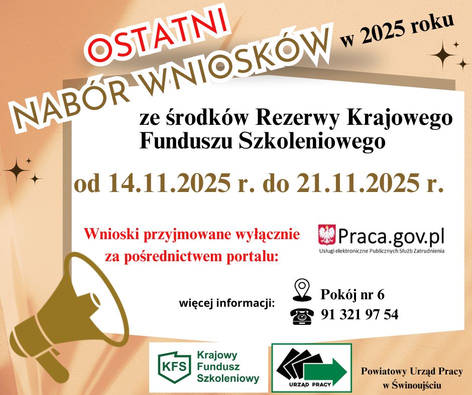 Powiatowy Urząd Pracy w Świnoujściu ogłasza nabór wniosków o dofinansowanie kosztów kształcenia ustawicznego ze środków Rezerwy Krajowego Funduszu Szkoleniowego 2025 r.