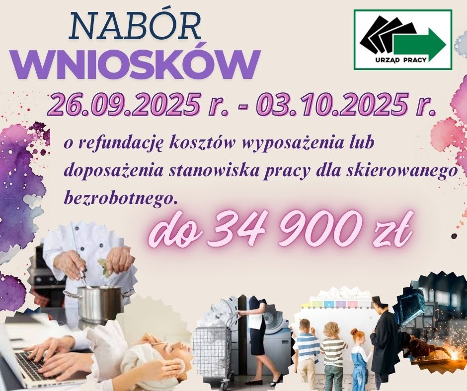 Powiatowy Urząd Pracy w Świnoujściu informuje, iż od 16.09.2025 r. rozpoczyna się nabór wniosków o refundację kosztów wyposażenia lub doposażenia stanowiska pracy dla skierowanego bezrobotnego.